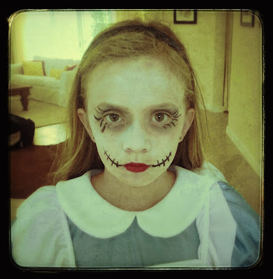 Olivia had wanted to go as Alice in Wonderland, but she just wasn't loving it when she tried the costume on. She played around a bit and was very happy with her new costume: Malice in Wonderland. Grace is the ethereal Corpse Bride.